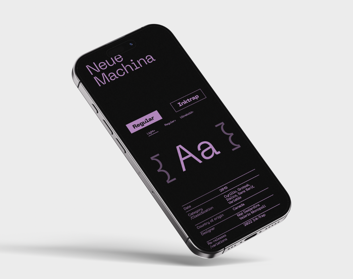A typeface ”suited for the future of technology,” Neue Machina takes inspiration from the robotic, machine-like themes that run deep in our rapidly encompassing digital age. The typeface was designed in 2019 by Montreal-based, Mat Desjardins and Valerio Monopoli from Pangram Pangram and last updated in May 2022 to include the Inktrap version. Categorised as a monospace, sans serif display type, it has a robotic, mechanical aesthetic. The Inktrap version incorporates gaps in certain areas of characters, initially designed to prevent pooling ink when printing and improve legibility for small type, now used as a style option to add a bit freshness.